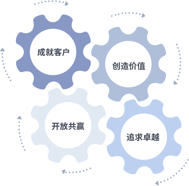 成就客户是一切决策的出发点,,创造价值是衡量所有工作的标准,,追求卓越是我们做事做人的态度,,,,开放共赢是我们的格局也是最终的结果。。。。价值观的齿轮环环相扣,,,,推动着组织里的每个人不断向前。。。。
